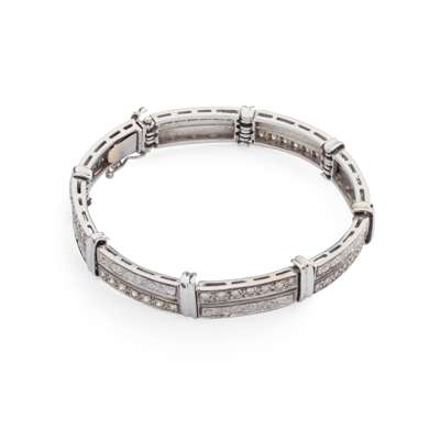 composed of rectangular links each set with a row of round brilliant-cut diamonds and engraved scrolling detail, stamped 750