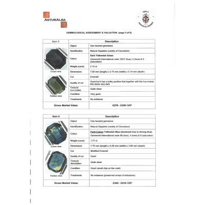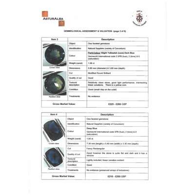 including a modified round brilliant-cut slight yellowish dark blue sapphire, a fancy rectangular-cut deep blue sapphire; an emerald-cut, dark yellowish-green sapphire, a modified emerald-cut, yellowish blue sapphire and two dark blue emerald-cut sapphires
