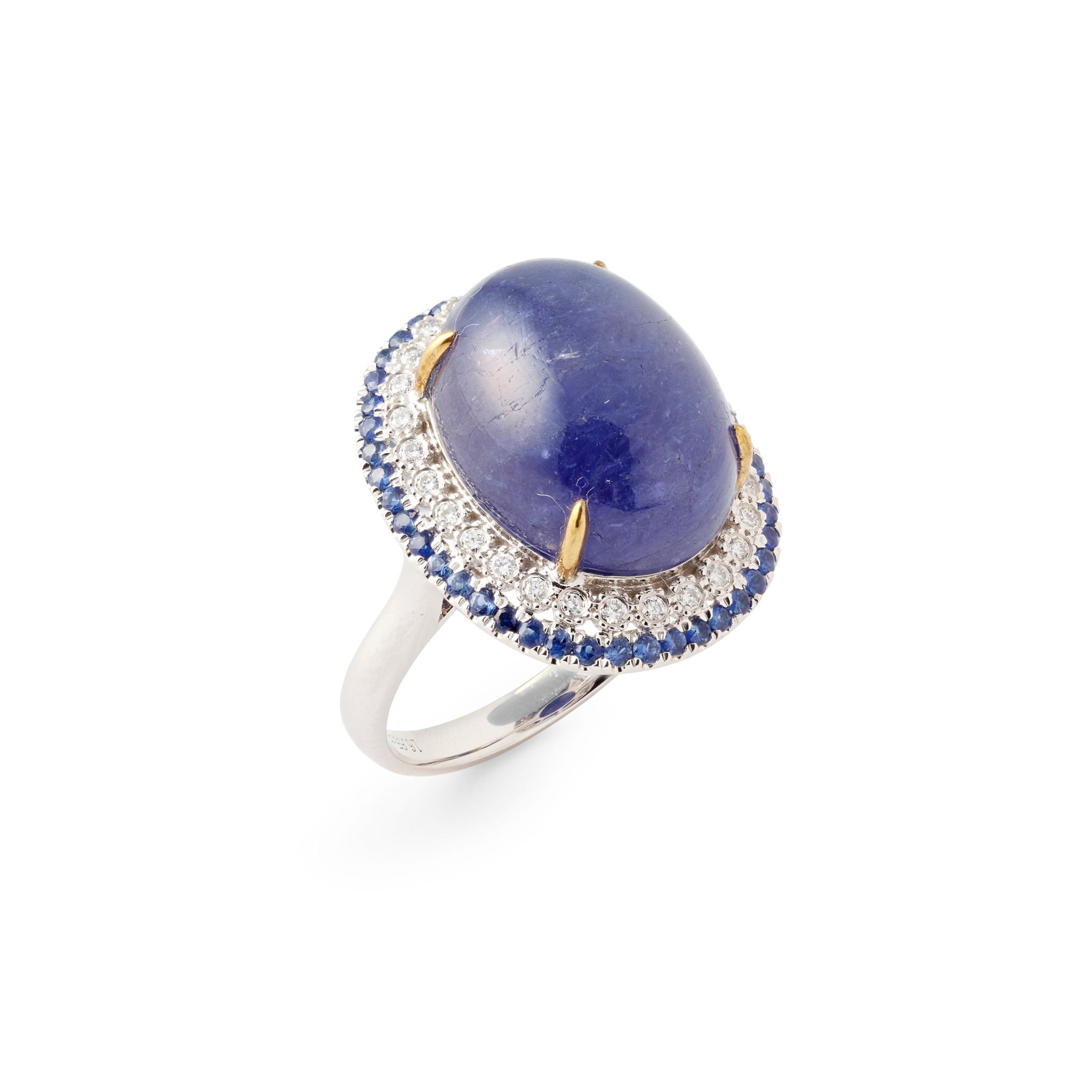 claw-set with a cabochon Tanzanite, in a border of round brilliant-cut diamonds and sapphires, mounted in 18ct gold