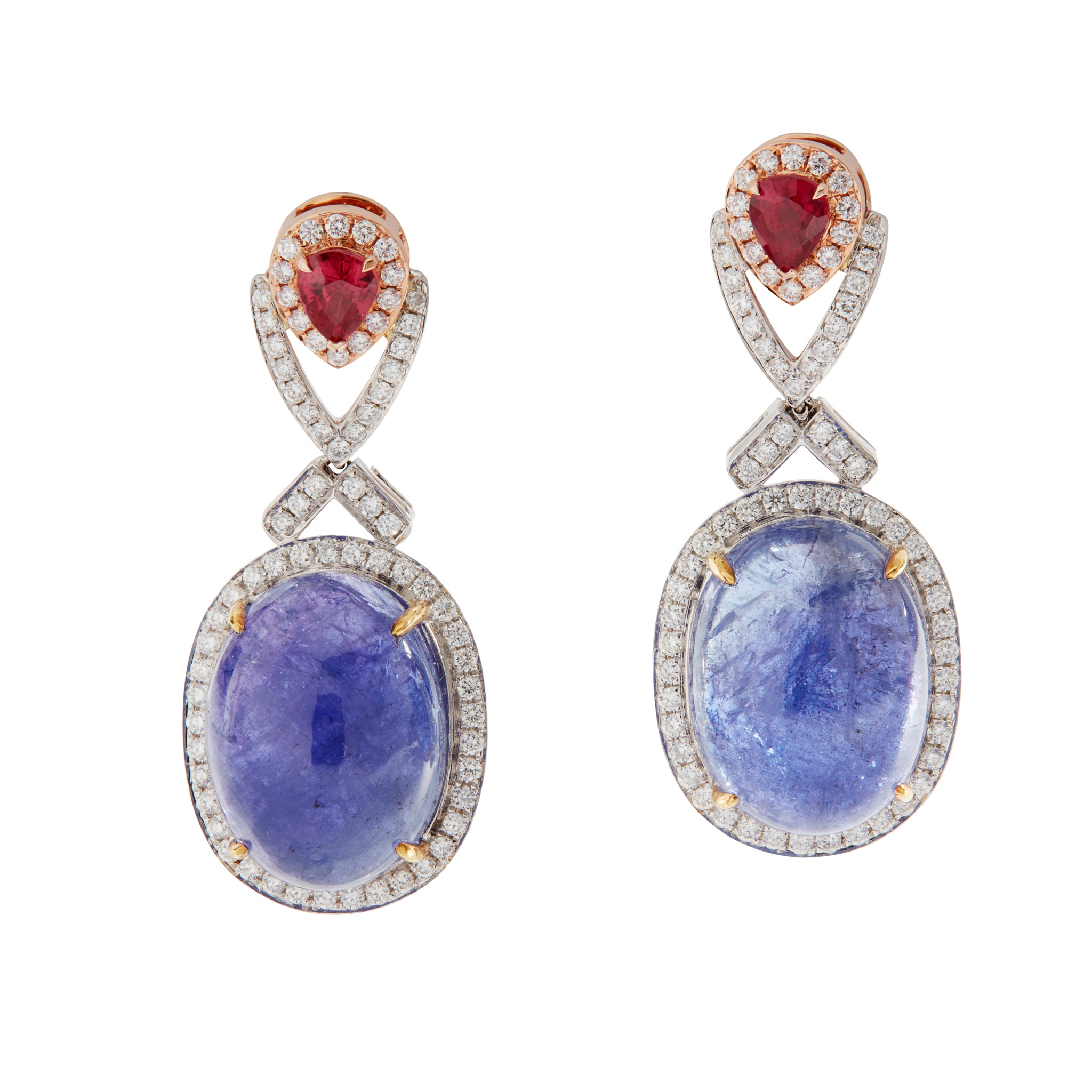 each claw-set with a pear-shaped ruby and a cabochon Tanzanite, in a surround of round brilliant-cut diamonds, to post and butterfly fittings, stamped Au750