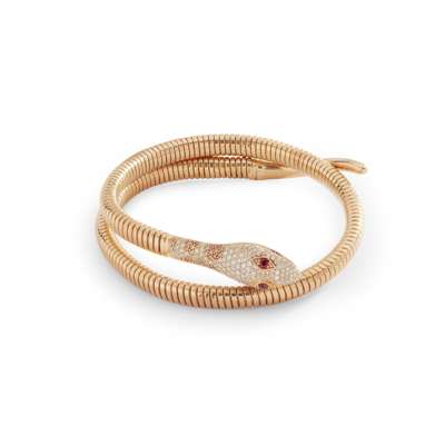 modelled as a coiled snake, the head pavé-set with graduated round brilliant-cut colourless and yellow diamonds, and two round-cut ruby eyes, to a sprung bracelet