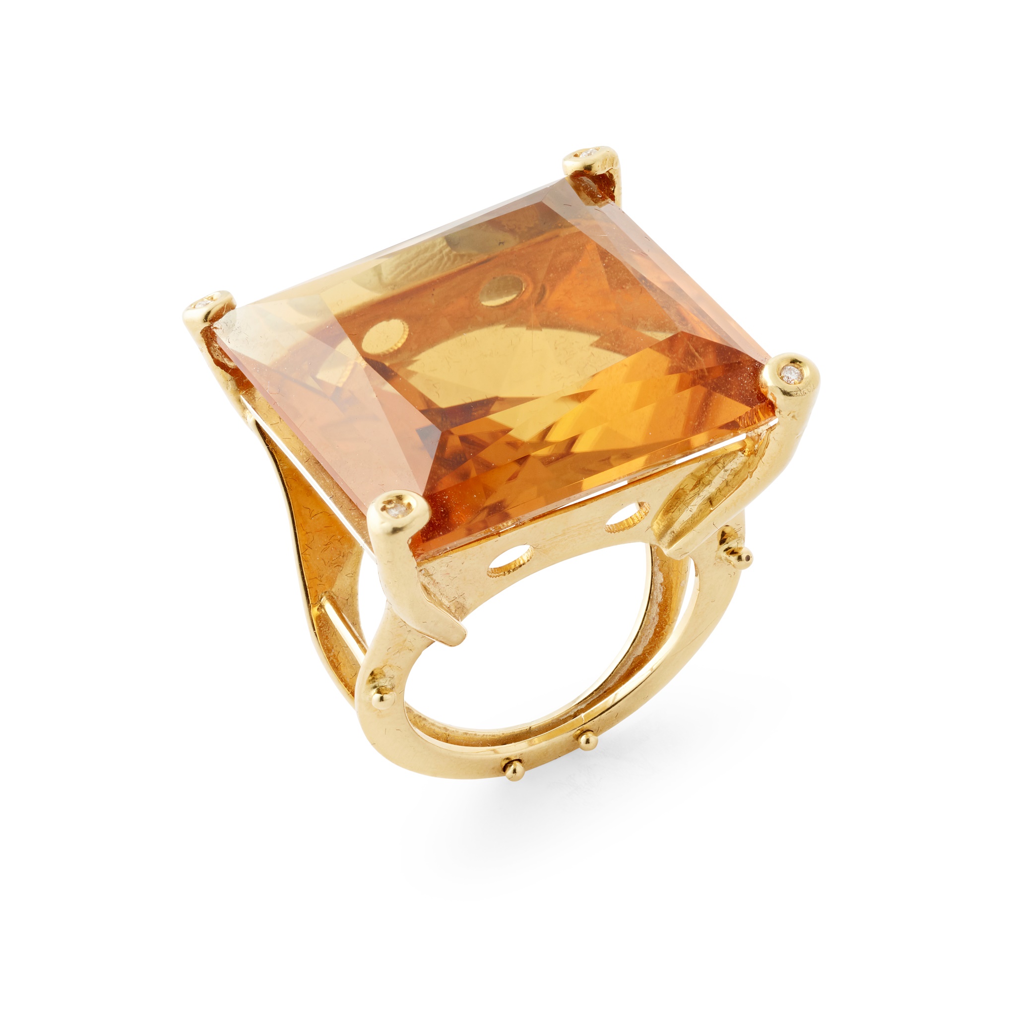claw-set with a large mixed square-cut citrine, each claw set with a small round brilliant-cut diamond, stamped 750