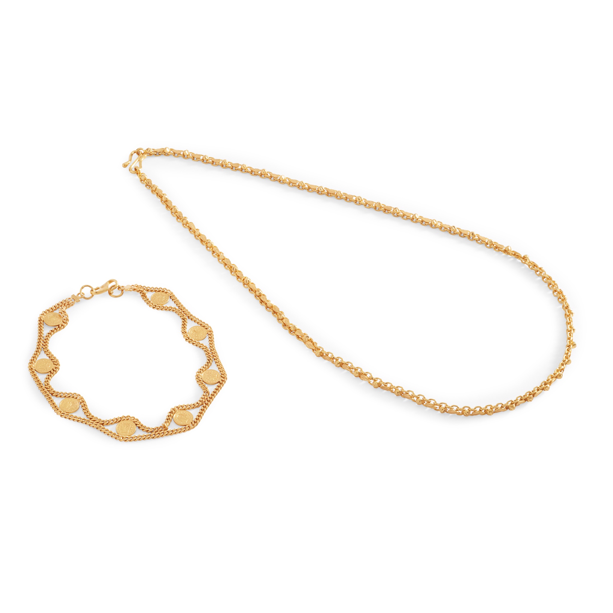set with eight small coins in a flattened curb link surround, stamped 916; together with a fancy link neck chain, unmarked