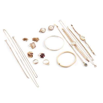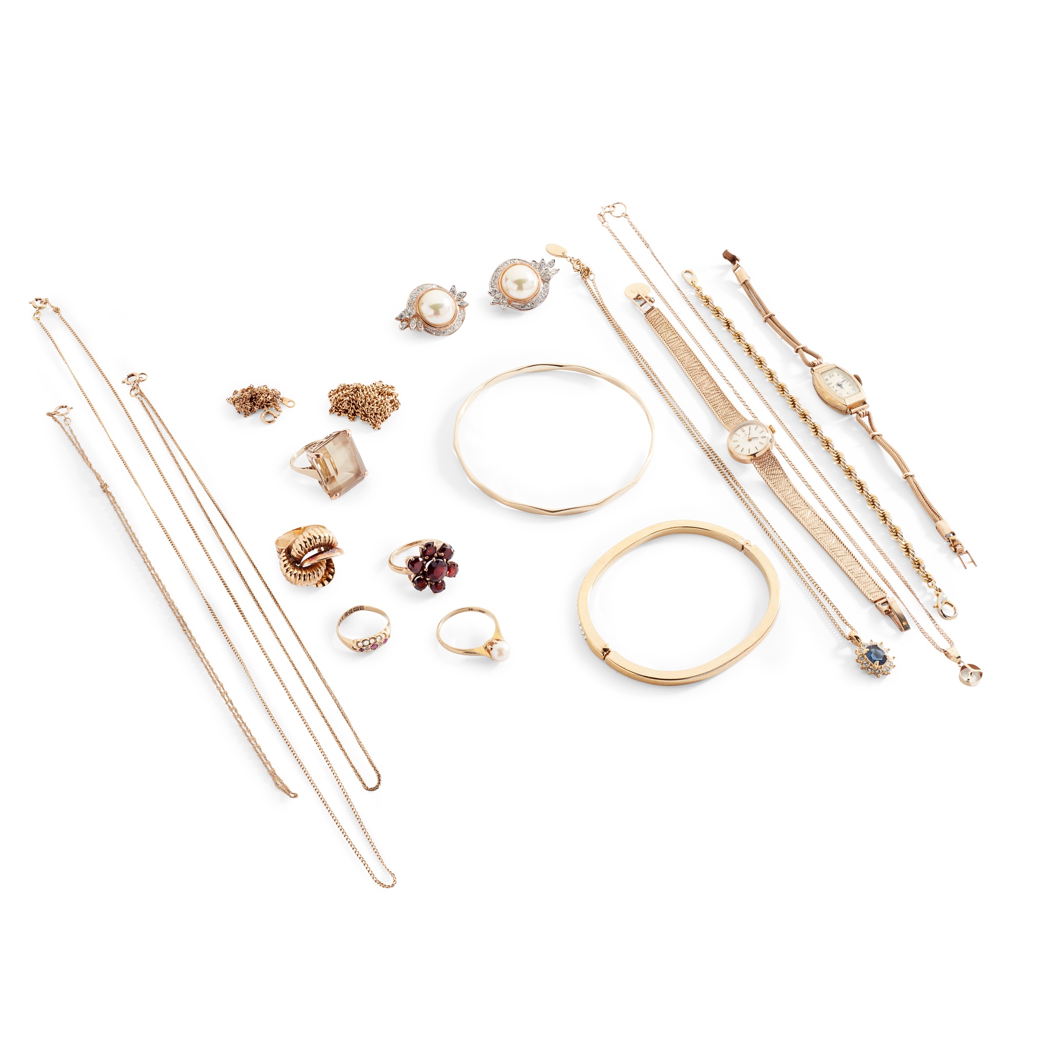 including a 9ct gold bangle, and 18ct gold ruby and diamond five-stone ring; a 9ct gold pearl ring, two neck chains, stamped 750; a 9ct gold citrine cocktail ring, a 9ct gold Omega wristwatch; various other rings, chains and costume jewellery
