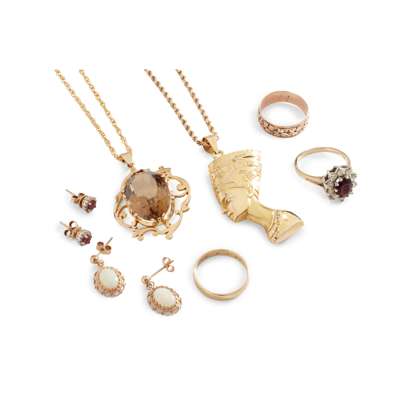 including a 'Nefertiti' pendant, unmarked, to a rope-twist chain, stamped 9c; a smokey quartz pendant to a trace link chain, unmarked; an 18ct gold wedding band and another 9ct gold example; a pair of ruby and diamond cluster earrings, unmarked; a pair opal pendant earrings and a 9ct gold garnet cluster ring