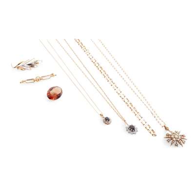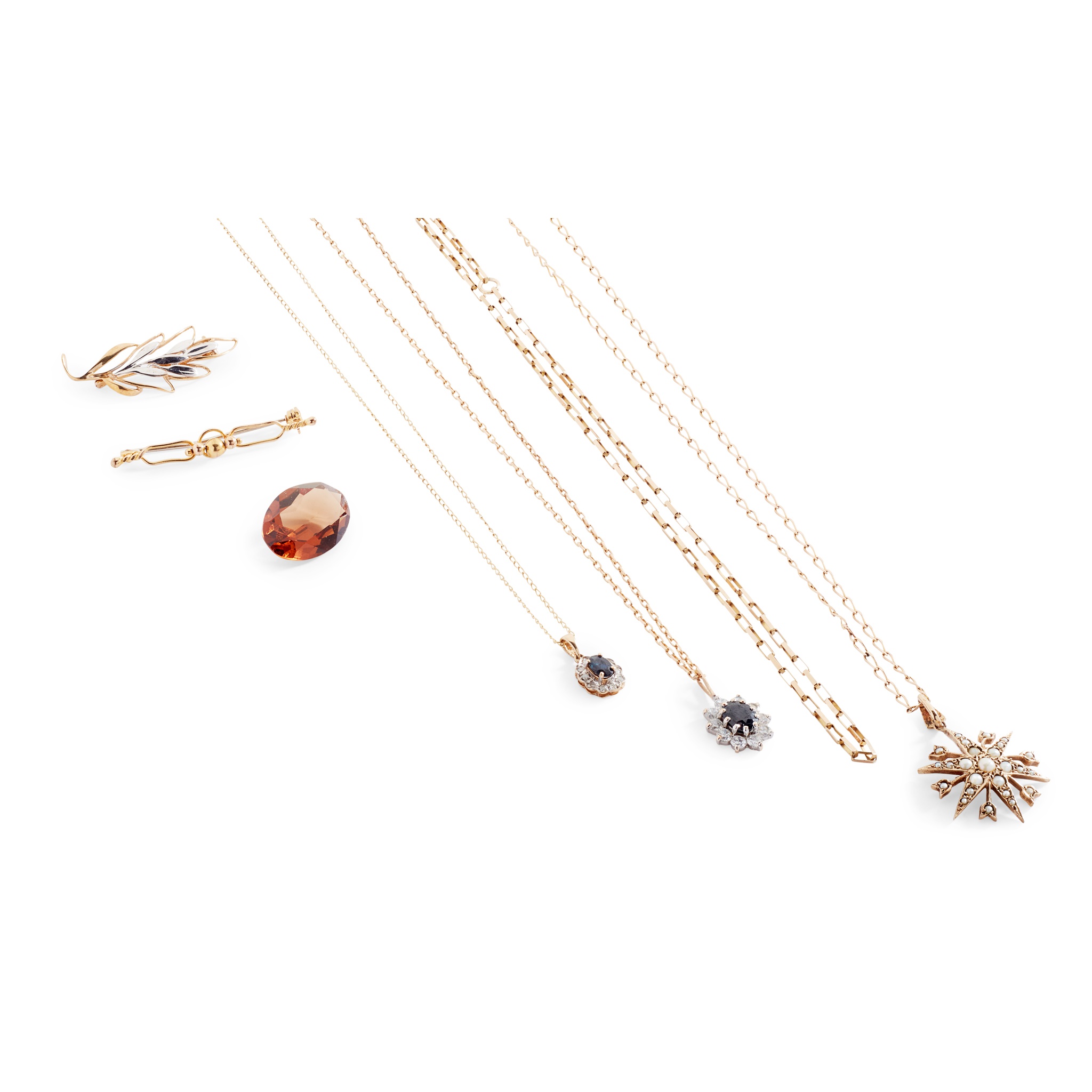 including a 9ct gold pearl star pendant necklace, a 9ct gold sapphire and diamond cluster pendant; a 9ct gold sapphire cluster pendant, a 9ct gold chain, two brooches and a loose paste gemstone
