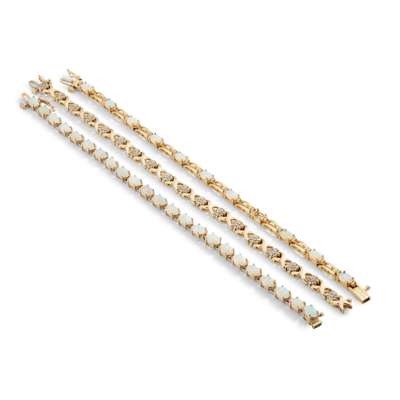 including a diamond cluster bracelet, stamped 14k; an opal and diamond bracelet, with pierced rectangular links, unmarked; and an opal bracelet, unmarked