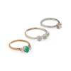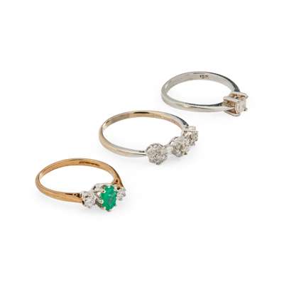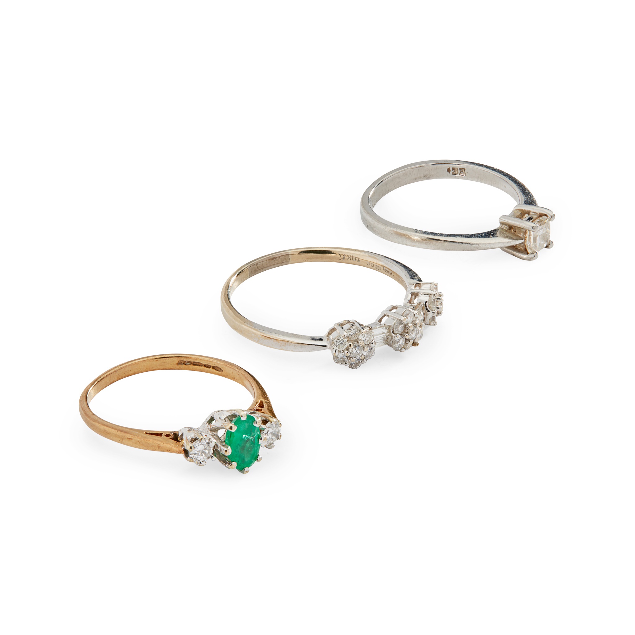 including a 9ct gold emerald and diamond three-stone ring, a platinum mounted single-stone princess-cut diamond ring; and an 18ct gold diamond triple-cluster ring