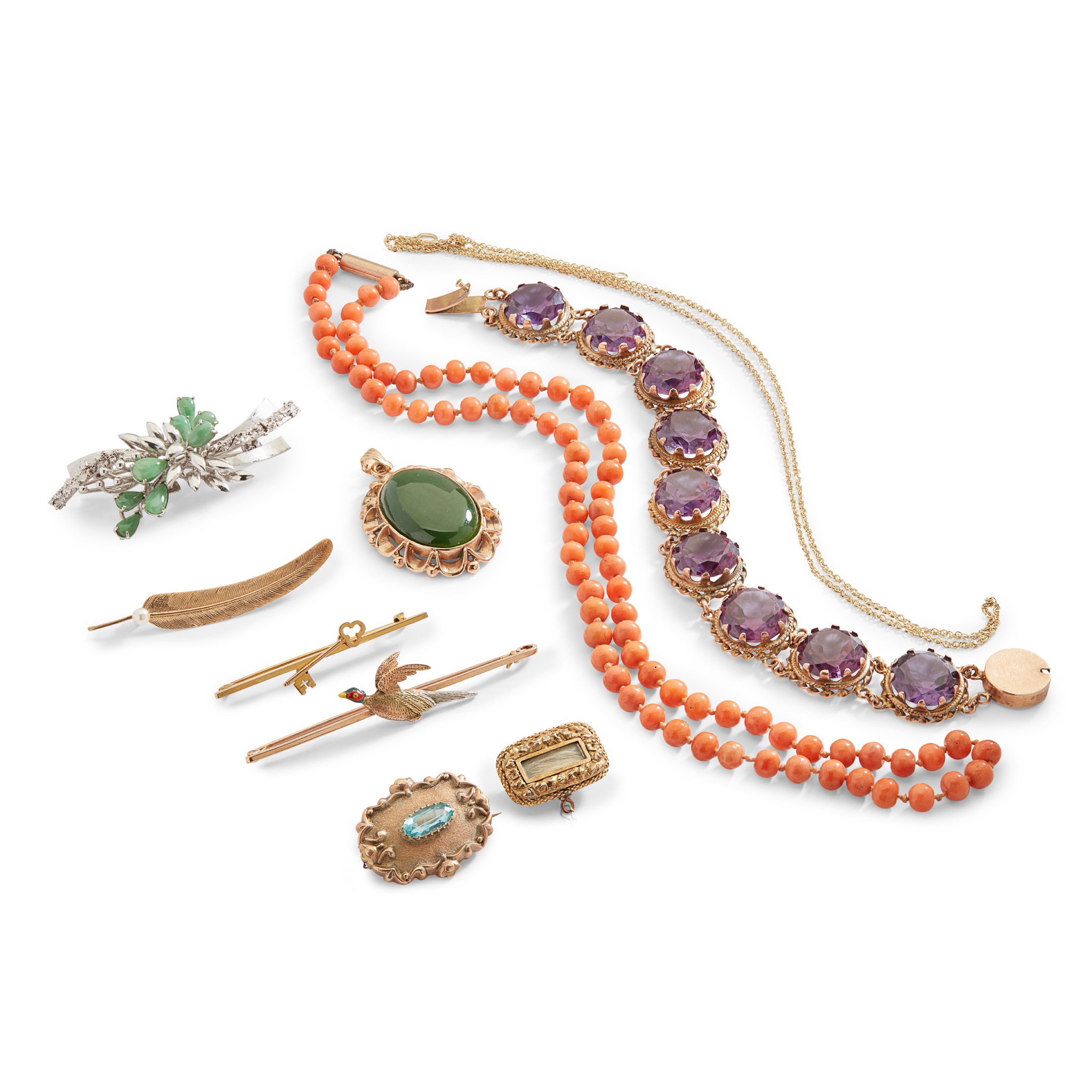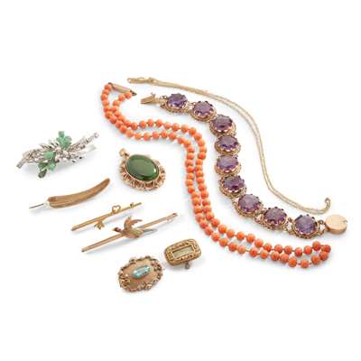 including a synthetic sapphire bracelet, stamped 14; a coral bead necklace, three various bar brooches; a jade brooch, stamped 18k; a 9ct gold trace link chain and various other brooches