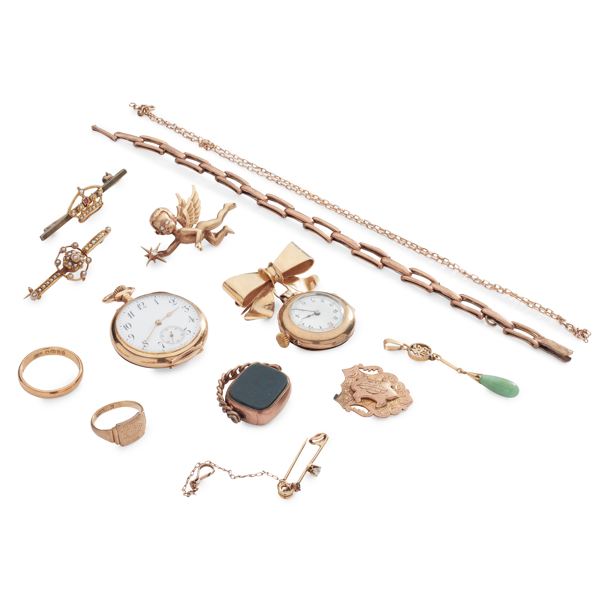 including a 22ct gold wedding band, a 9ct gold signet ring and medal; a 9ct gold fob watch, an open-faced pocket watch, stamped 585; various other chains, gem-set brooches and fobs