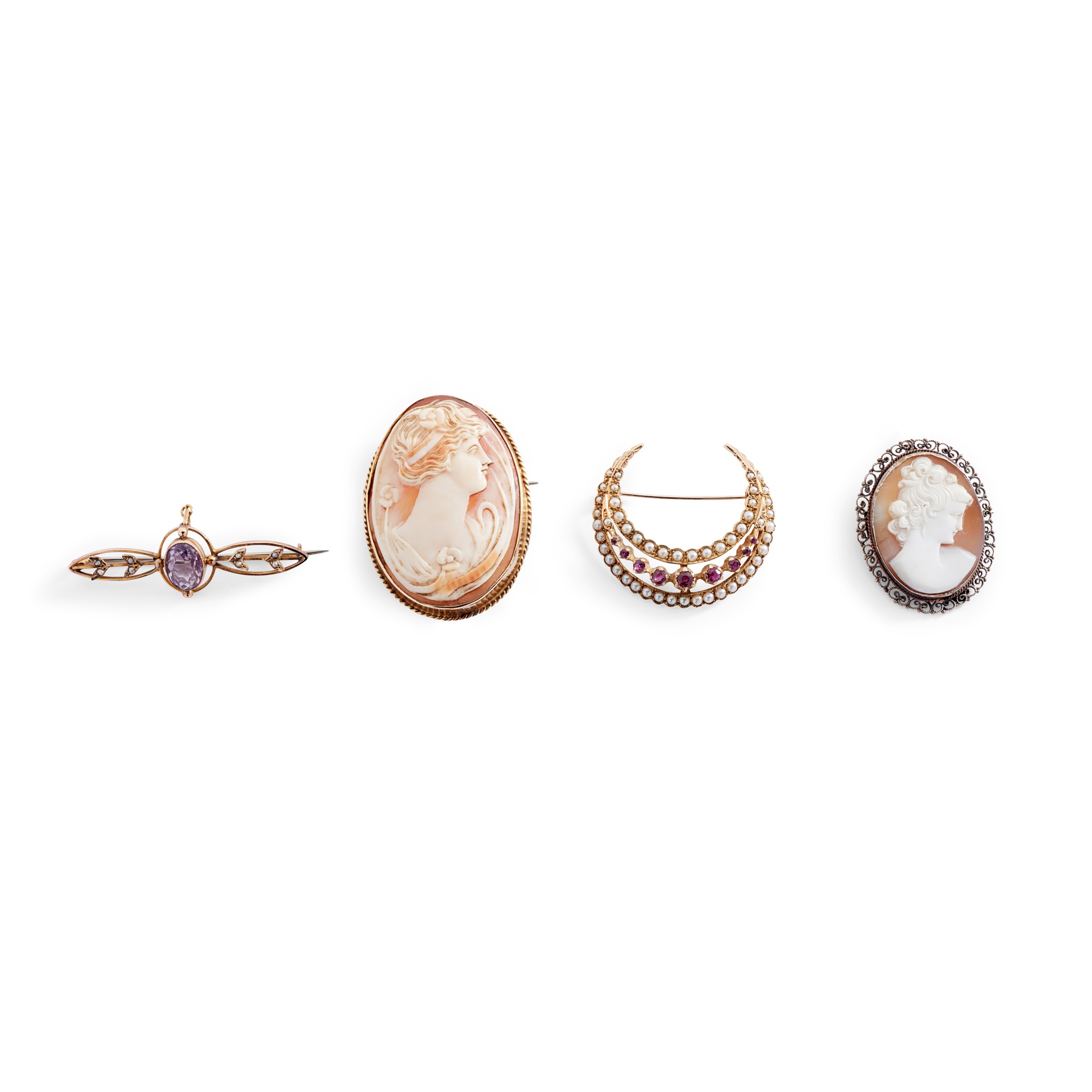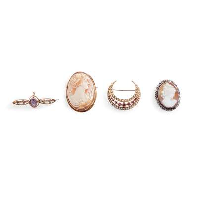 including a 9ct gold garnet and pearl crescent brooch, a 9ct gold cameo brooch; an amethyst and seed pearl bar brooch, stamped 9c, and a smaller cameo brooch, stamped 800