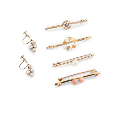 including two pearl bar brooches, stamped 9ct or 14k; a coral bar brooch, unmarked; an aquamarine and seed pearl bar brooch, stamped 15ct; and a pair of pearl pendent earrings, stamped 15ct