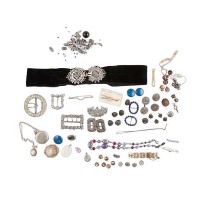 including various paste set buckles, various purple glass and banded agate buttons; various other buttons, beaded necklaces, gem-set brooches etc.