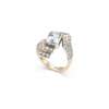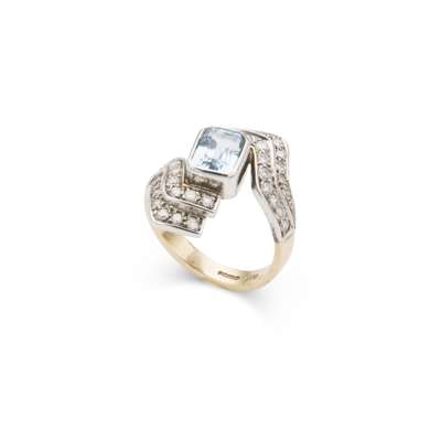 of geometric design, collet-set with a cut-cornered rectangular-cut aquamarine, angular diamond set shoulders, modelled in 9ct gold