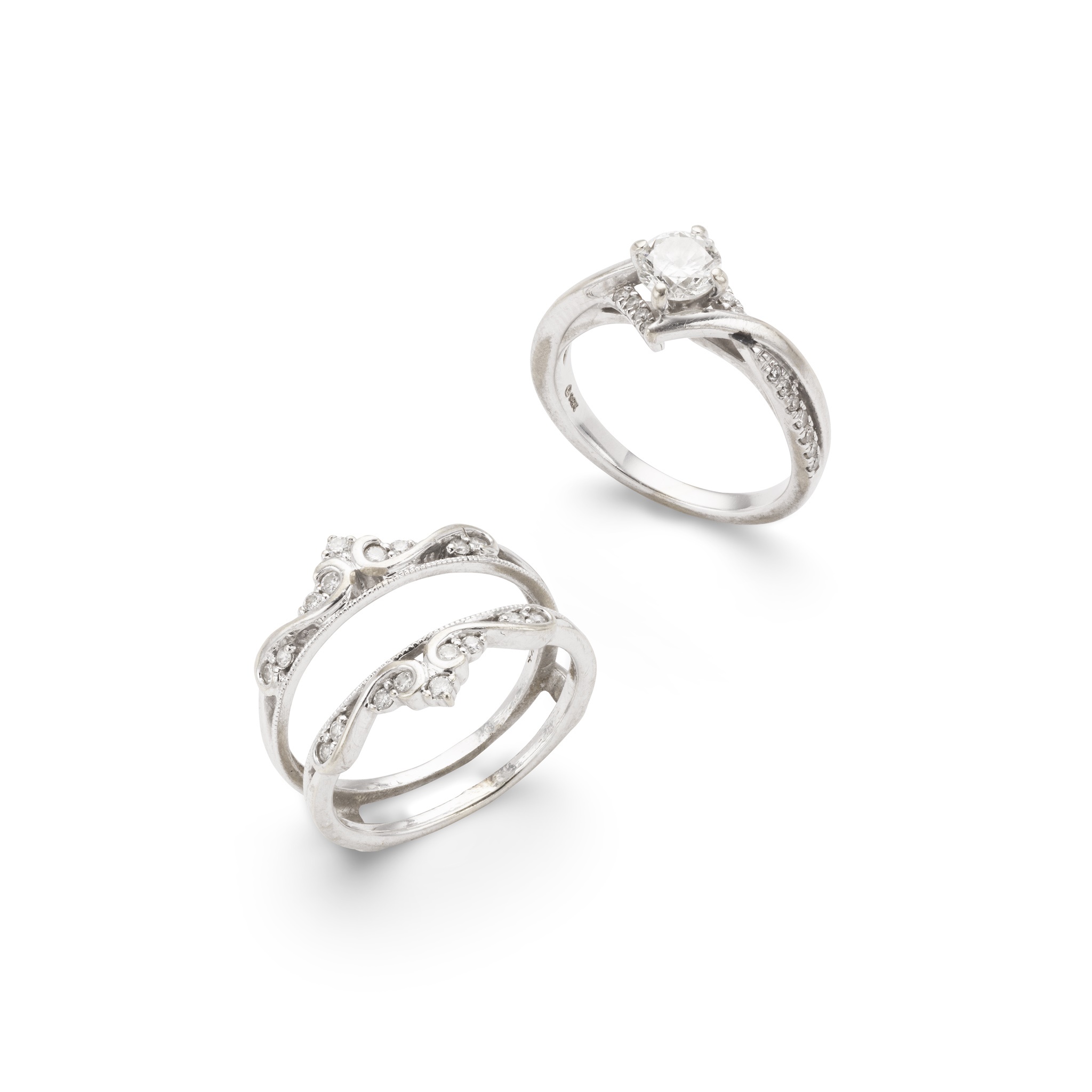 the central ring claw-set with a round brilliant-cut diamond, the shoulders set with small round brilliant-cut diamonds, with a removable ring surrounding it with a scrolling diamond-set design, both stamped 14K