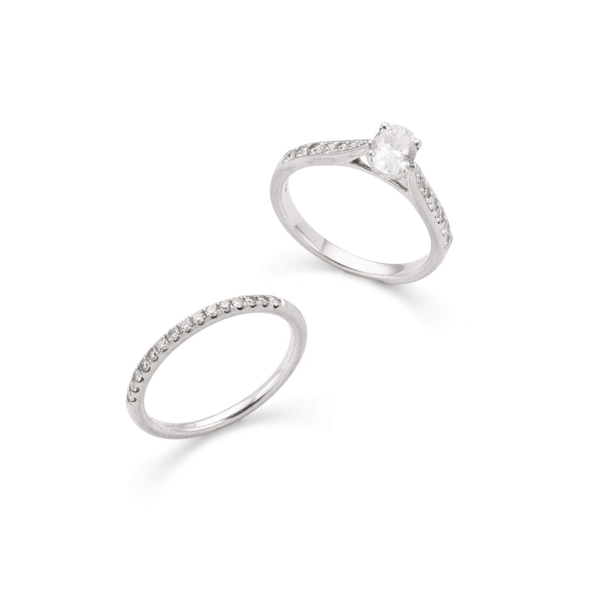 claw-set with an oval brilliant-cut diamond, each shoulder set with seven graduated round brilliant-cut diamonds, to a plain band, modelled in platinum; together with a diamond half-eternity ring, modelled in platinum