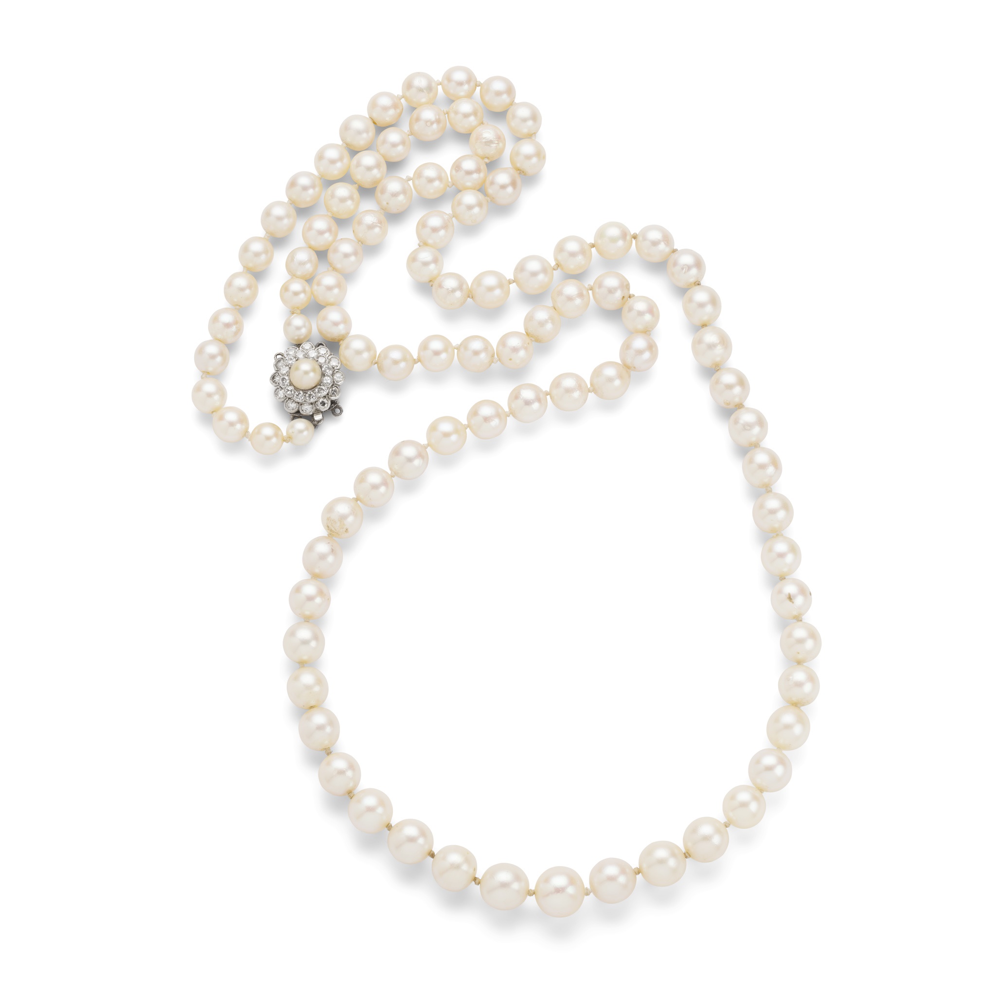 composed of a single strand of slightly graduated cultured pearls, the clasp set with a cultured pearl in a double border of old round and eight-cut diamonds, unmarked