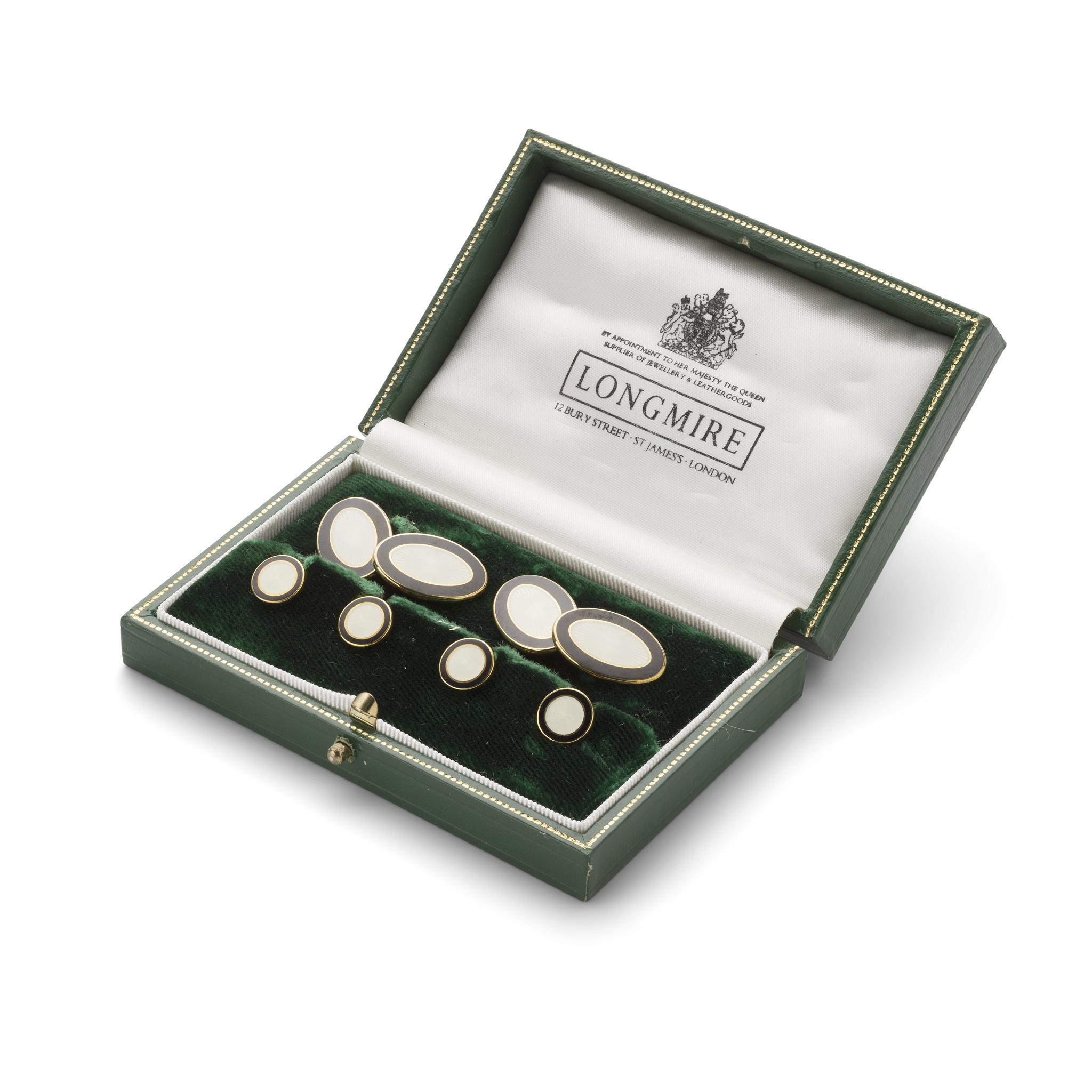 comprising a pair of cufflinks and four matching studs, each with white guilloche enamel in a black enamel frame, modelled in 9ct gold, in a fitted case for Longmire