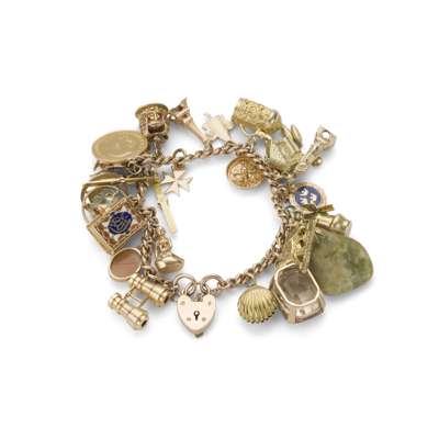 composed of curb links and padlock clasp, suspending various charms including a 1912 half sovereign, a pair of binoculars, a Swiss cheese etc.