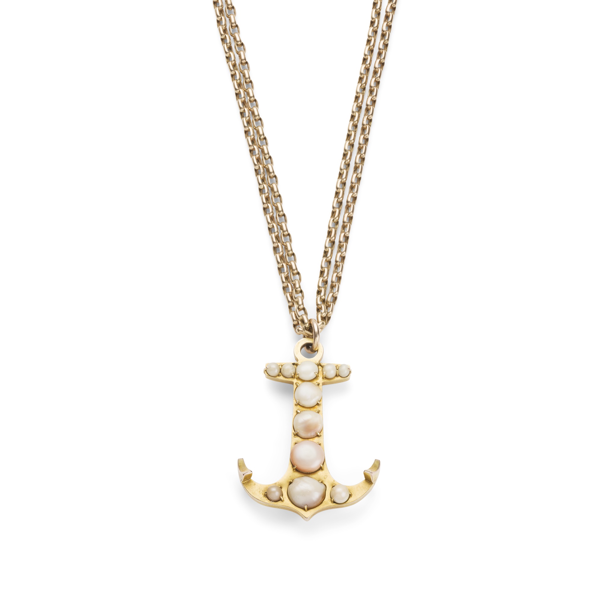 modelled as an anchor and set throughout with graduated bouton freshwater pearls (untested), stamped 9ct, to a belcher-link chain, clasp stamped 9ct