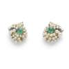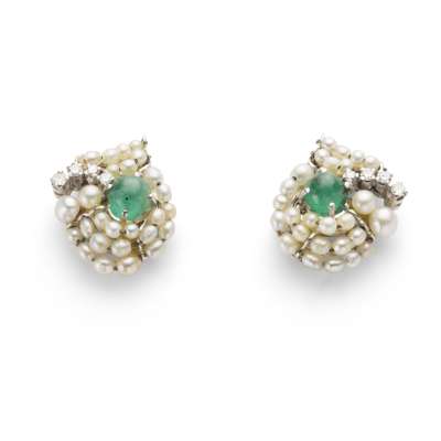 each claw-set set with a cabochon emerald, in a scrolling border of pearls, round brilliant and eight-cut diamonds, clip fittings, unmarked