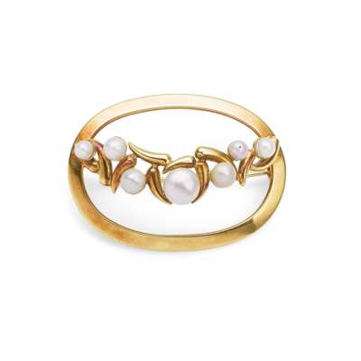of oval outline, the central motif set with seven bouton Scottish freshwater pearls, modelled in 18ct gold