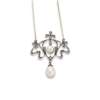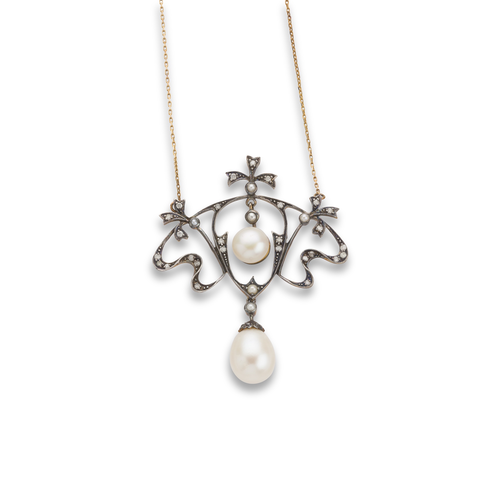 of scrolling design set throughout with round-cut diamonds and two cultured pearl drops, to an integral trace-link chain, unmarked
