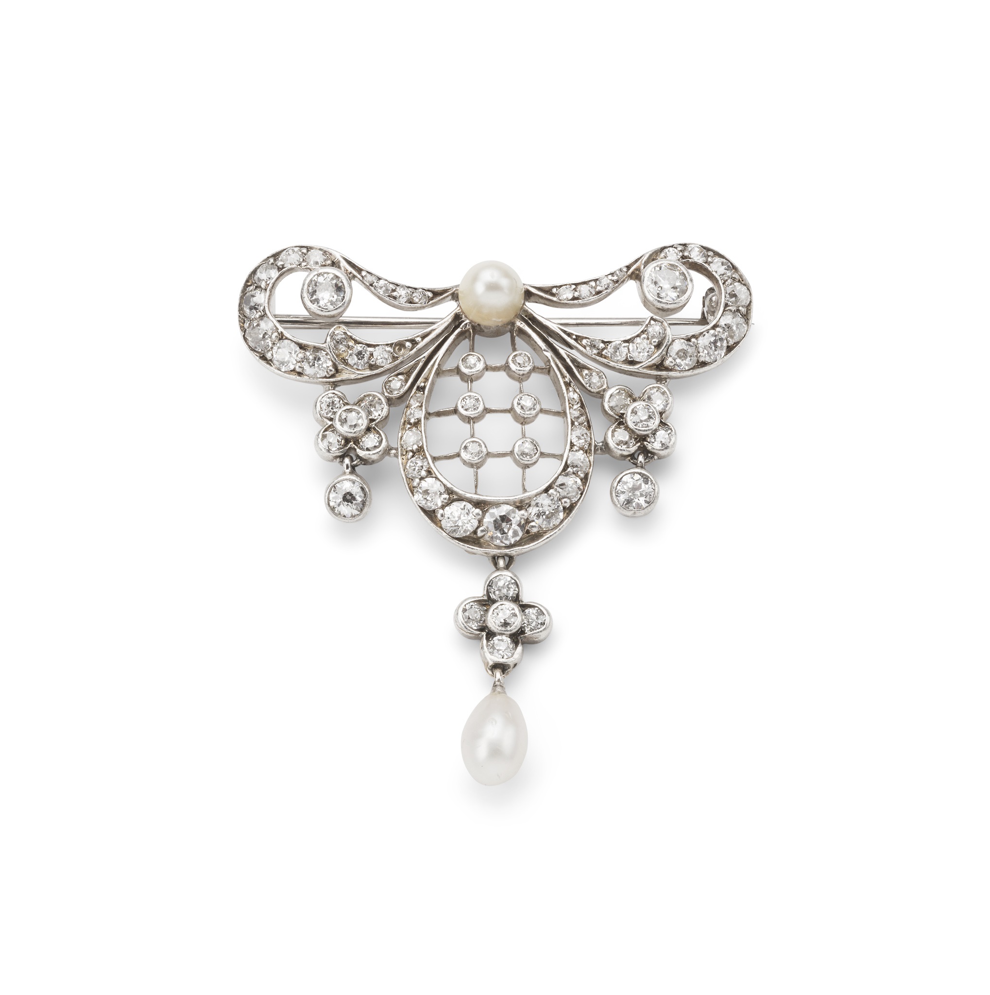 of stylized swag motif, set throughout with graduated old round-cut diamonds and a central bouton pearl, suspending a pearl and diamond drop, unmarked