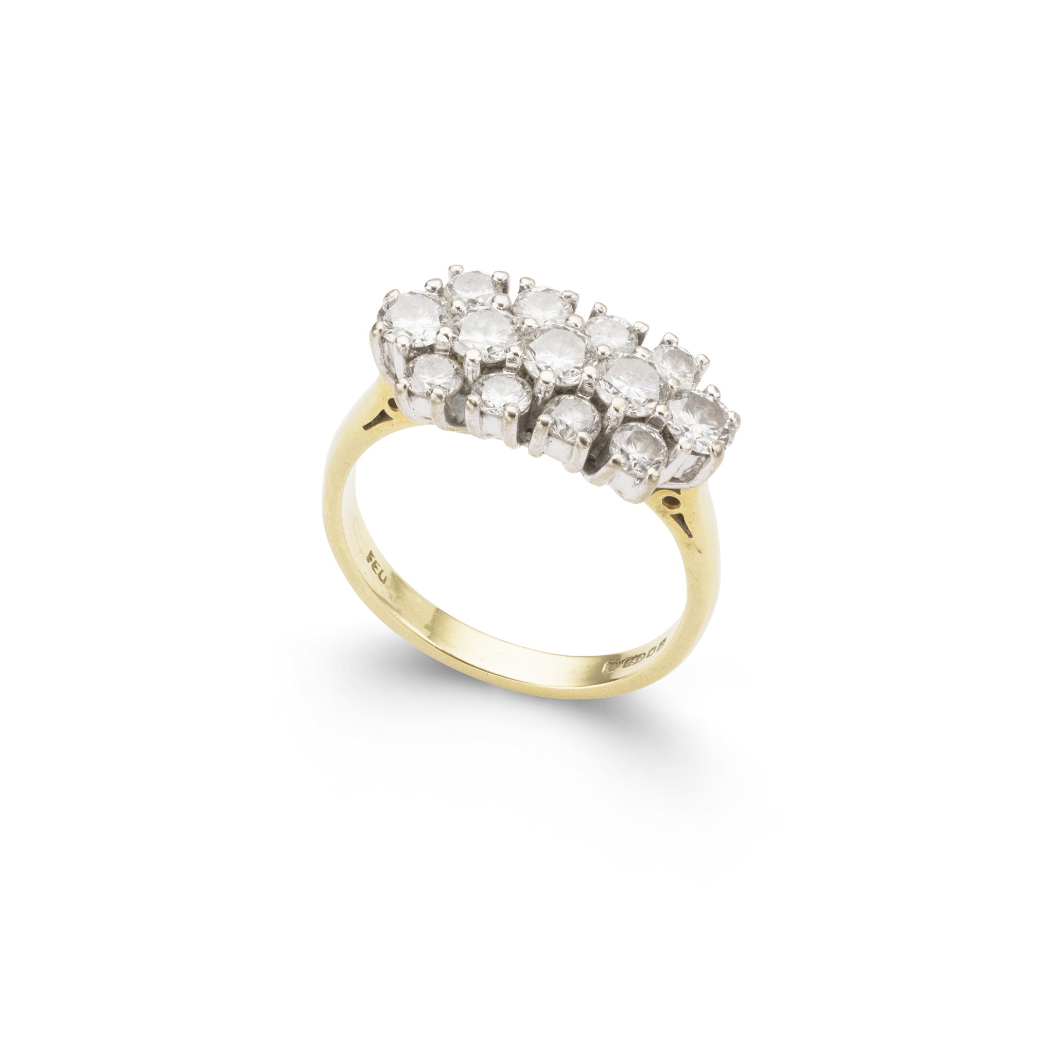 claw-set with three rows of graduated round brilliant-cut diamonds, to a plain band, modelled in 18ct gold