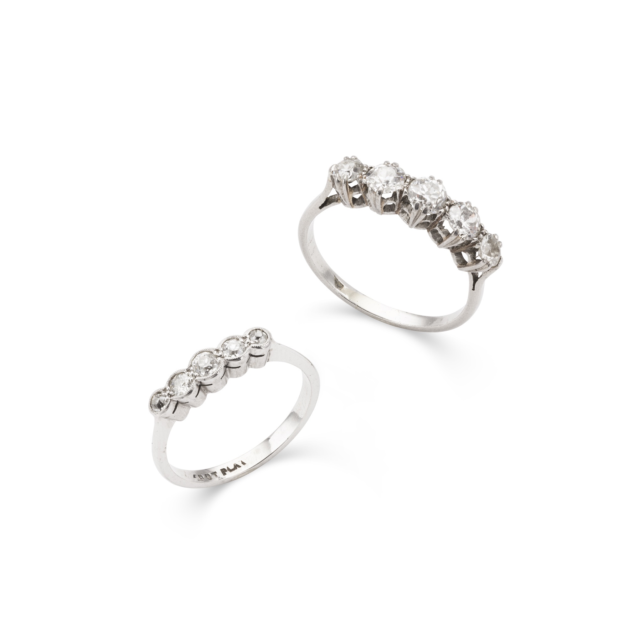 the first claw-set with five graduated old-cut diamonds, to a plain band, unmarked; the second millegrain-set with five graduated old-cut diamonds, to a plain band, stamped 18ct & PLAT