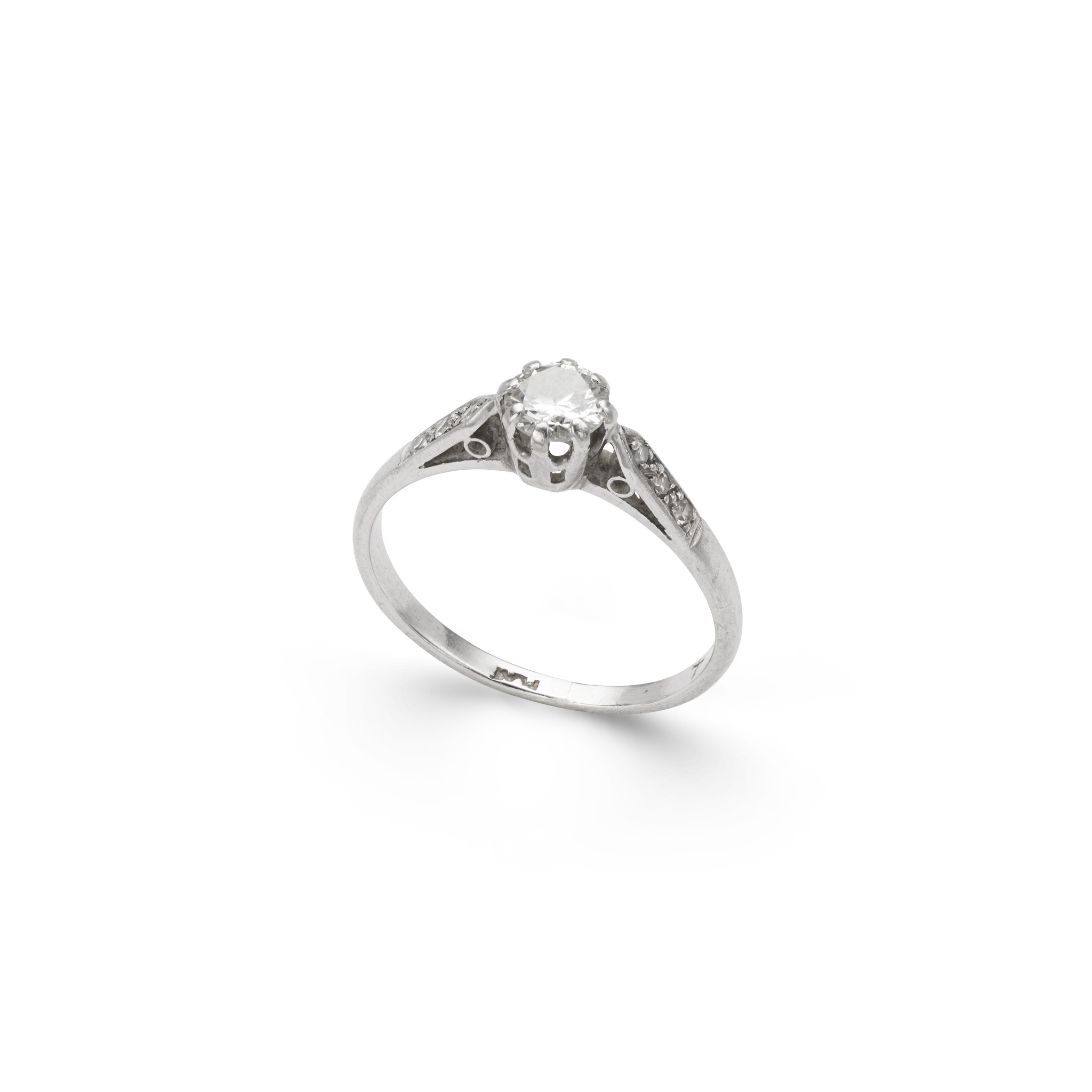 claw-set with an old round-cut diamond, each shoulder set with three small eight-cut diamonds, to a plain band, stamped PLAT