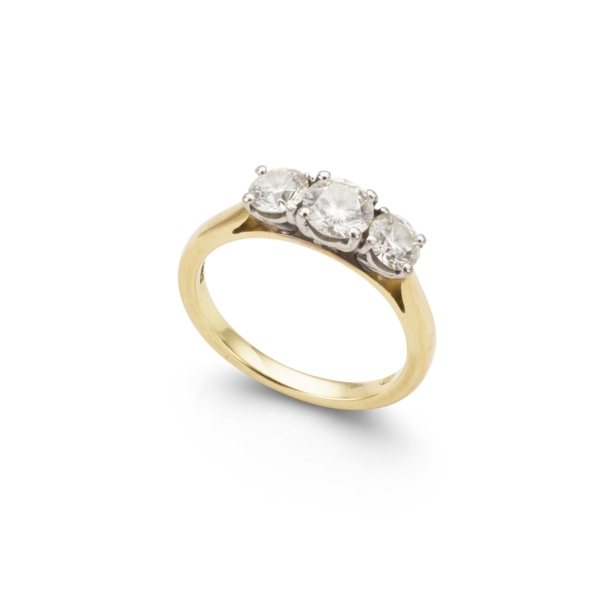 claw-set with three graduated round brilliant-cut diamonds, to a plain band, modelled in 18ct gold