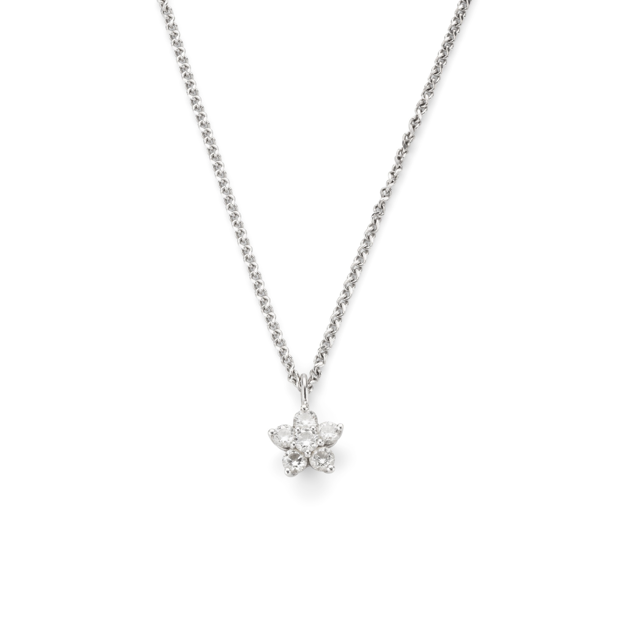 claw-set with six round brilliant-cut diamonds, modelled in 18ct gold, to a trace-link chain stamped ITALY 750