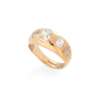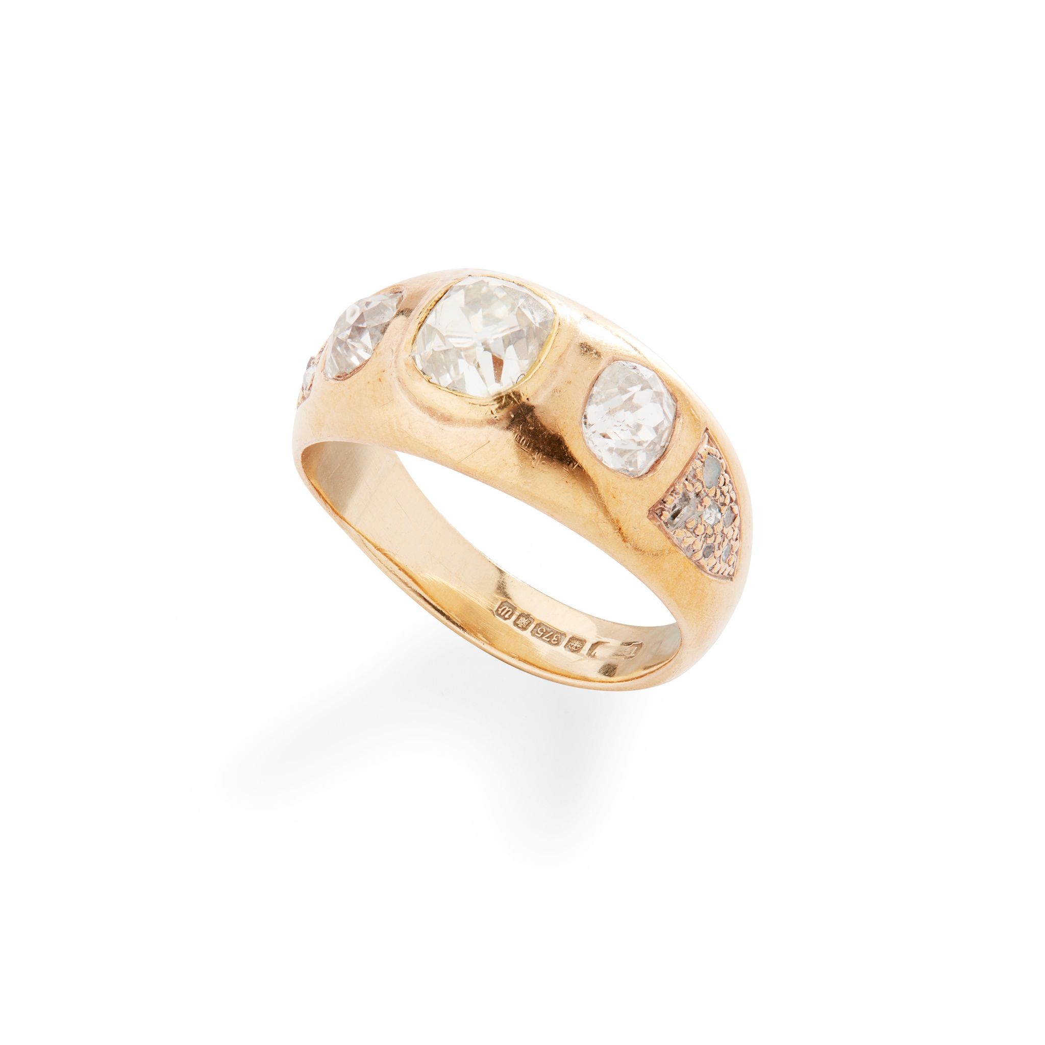 gypsy-set with three graduated cushion-cut diamonds, each shoulder with pavé-set rose-cut diamond clusters, modelled in 9ct gold