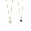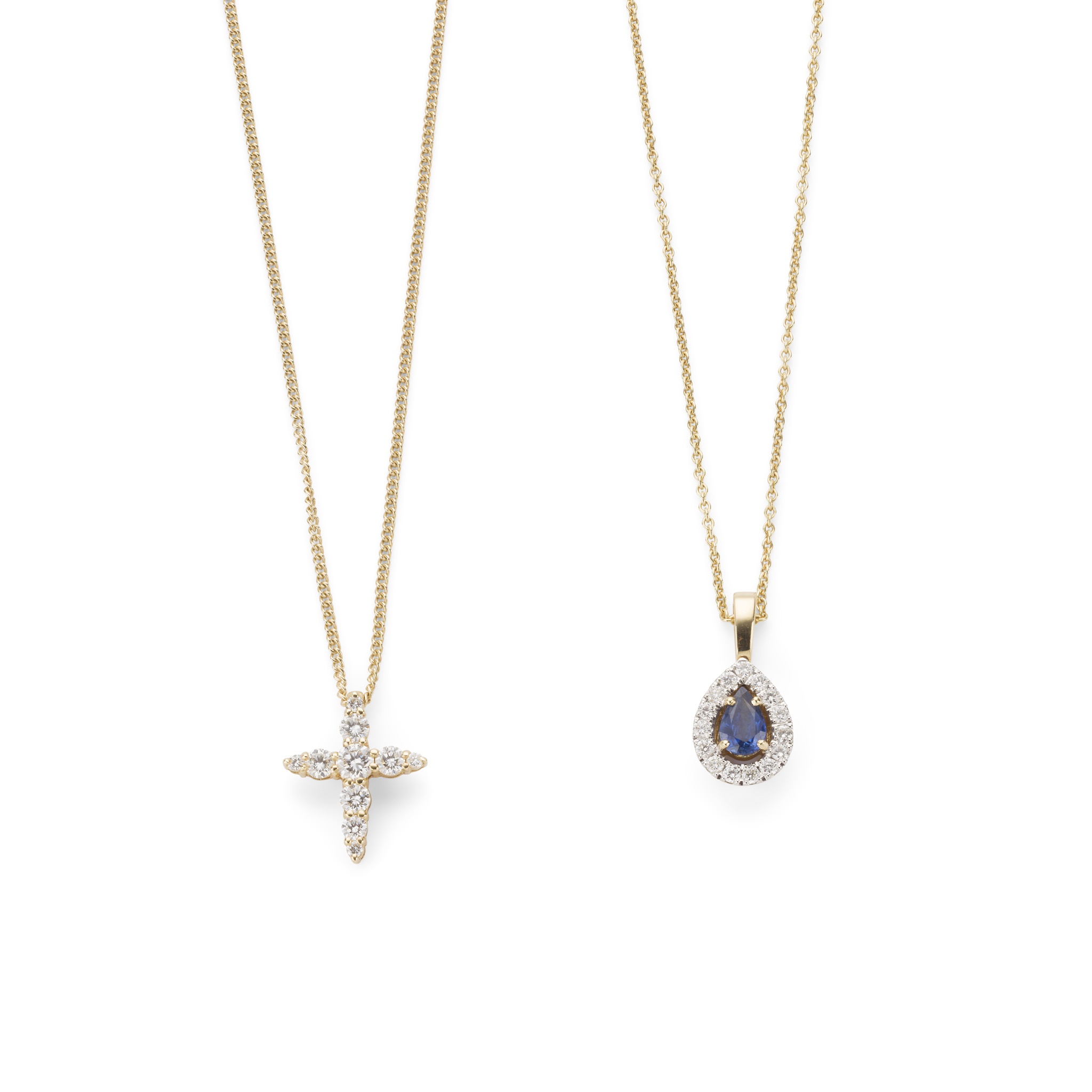 the first claw-set with a pear-shaped sapphire in a border of round brilliant-cut diamonds, modelled in 18ct gold, to an 18ct gold trace-link chain; the second modelled as a cross, set with graduated round brilliant-cut diamonds, to an 18ct gold trace-link chain