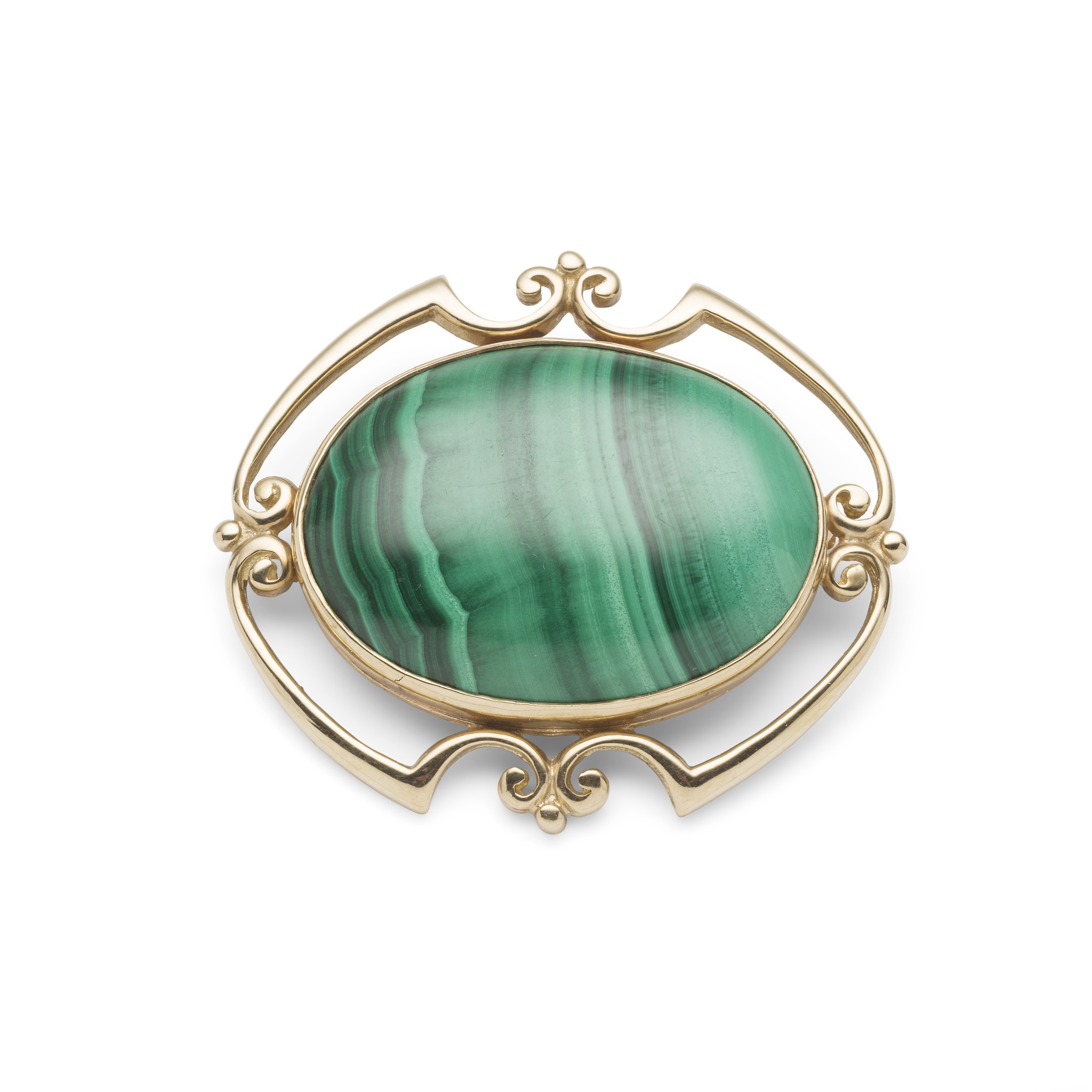 collet-set with an oval cabochon malachite, in an open scrolling border, modelled in 9ct gold