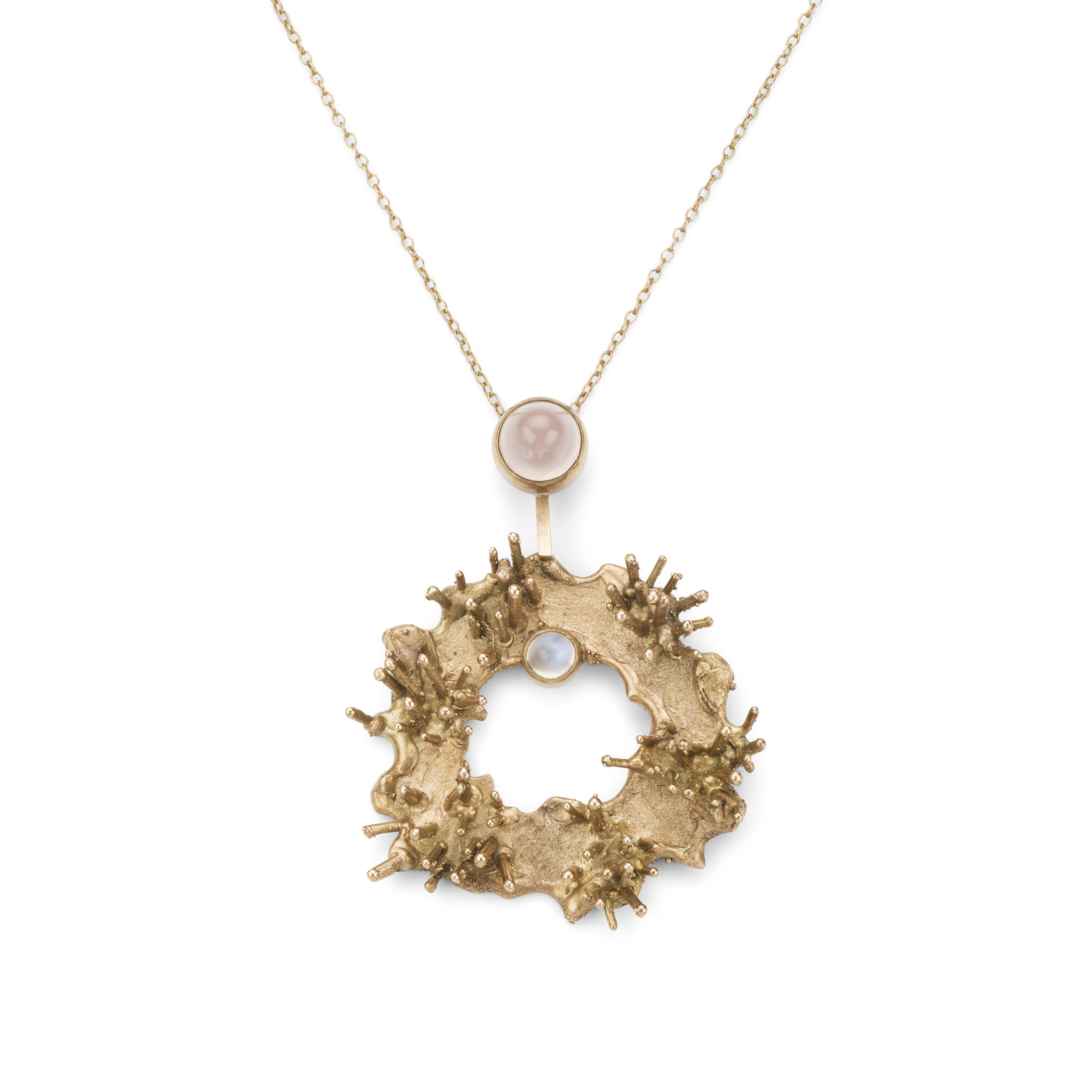 of stylized design, collet-set with a cabochon moonstone and rose quartz, modelled in 9ct gold, to a trace-link chain