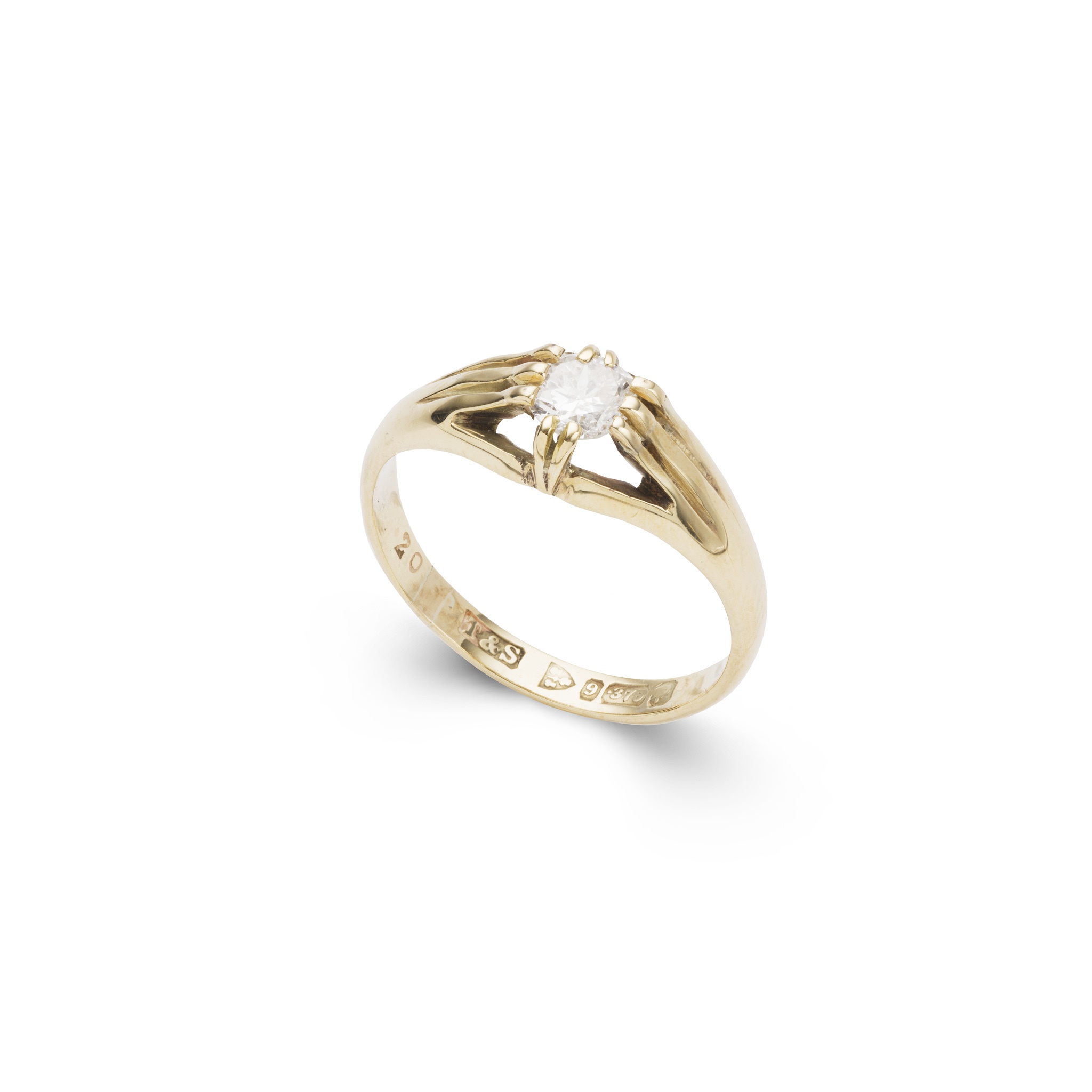 claw-set with a round brilliant-cut diamond, to a plain band, modelled in 9ct gold