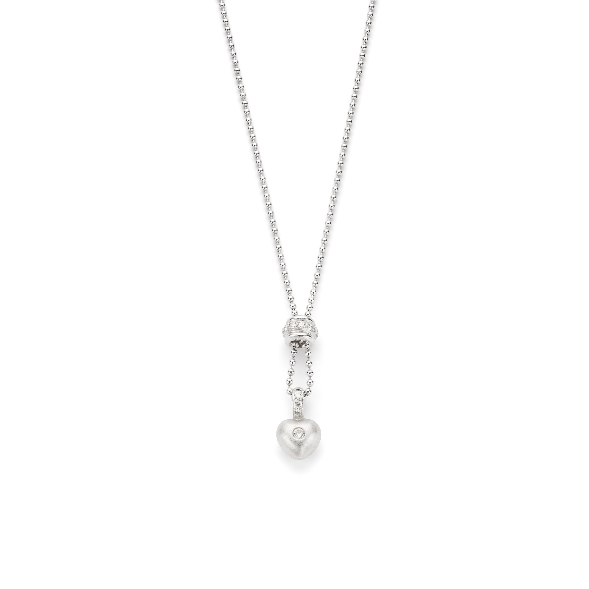 the heart-shaped pendant set with four round brilliant-cut diamonds, below a diamond-set spacer, to a ball-link chain, modelled in 18ct gold
