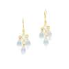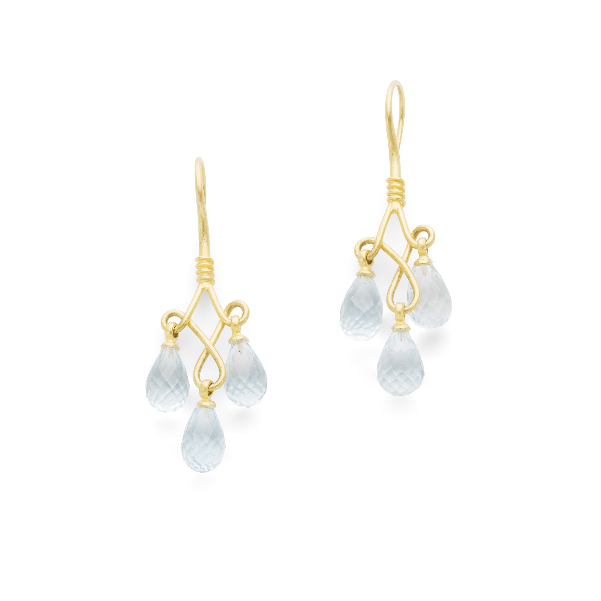 each suspending three briolette-cut blue topaz, to a satin finish mount and long hook fitting, modelled in 18ct gold