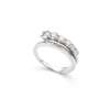 claw-set with a row of six graduated round brilliant-cut diamonds, to a plain band, modelled in 18ct white gold