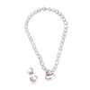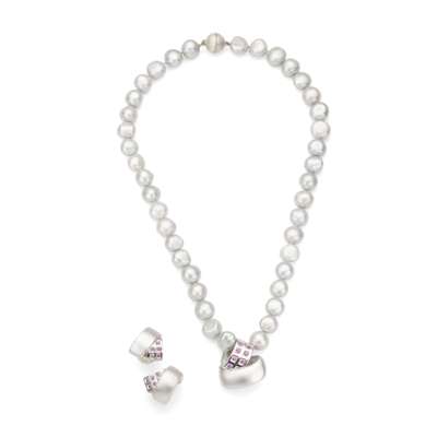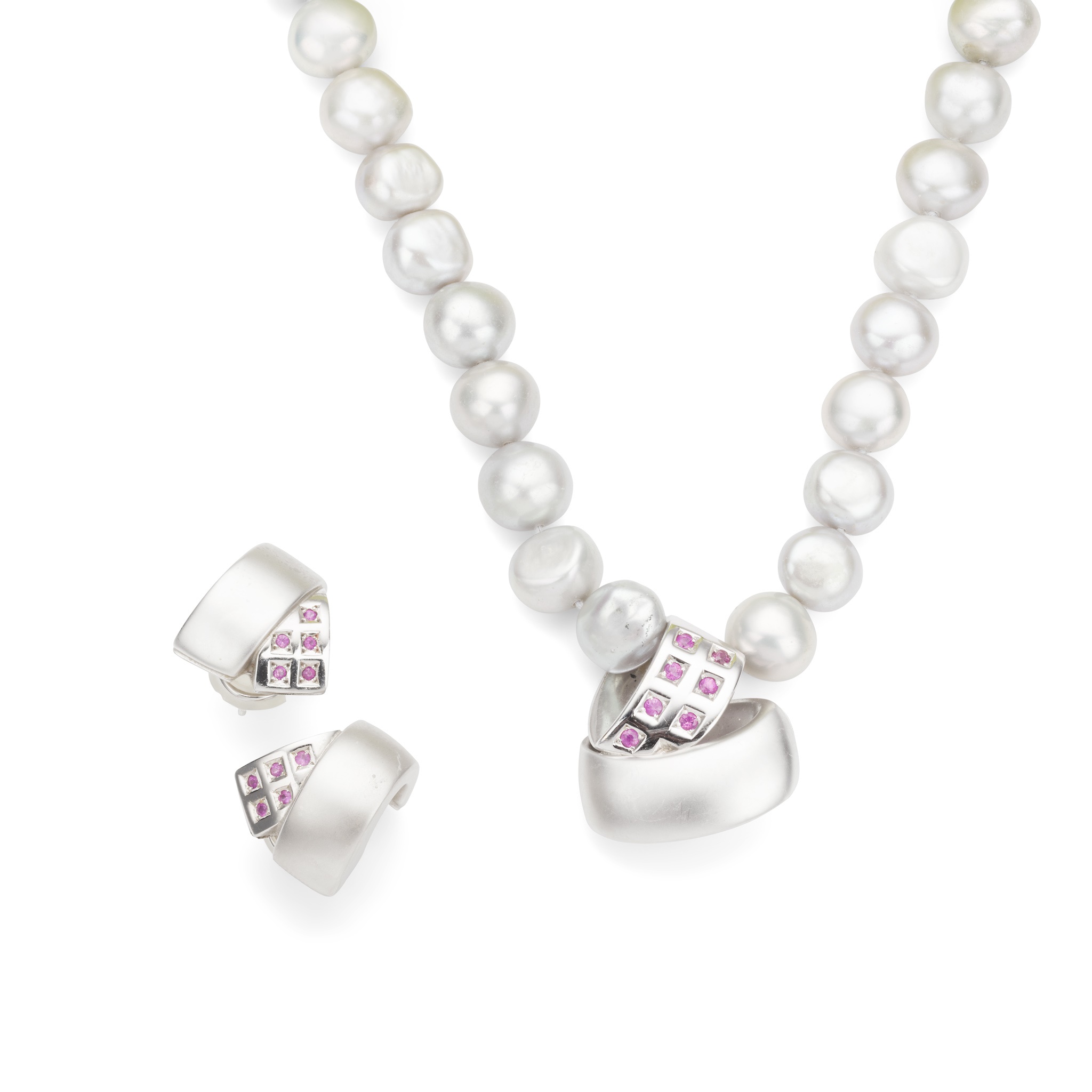 composed of a single row of cultured grey pearls, the central stylized pendant, set with round-cut rubies; together with a pair of matching earrings, to post and clip fittings, modelled in 18ct gold