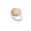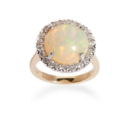 claw-set with a circular cabochon opal in a border of round brilliant-cut diamonds, modelled in 14ct gold
