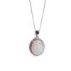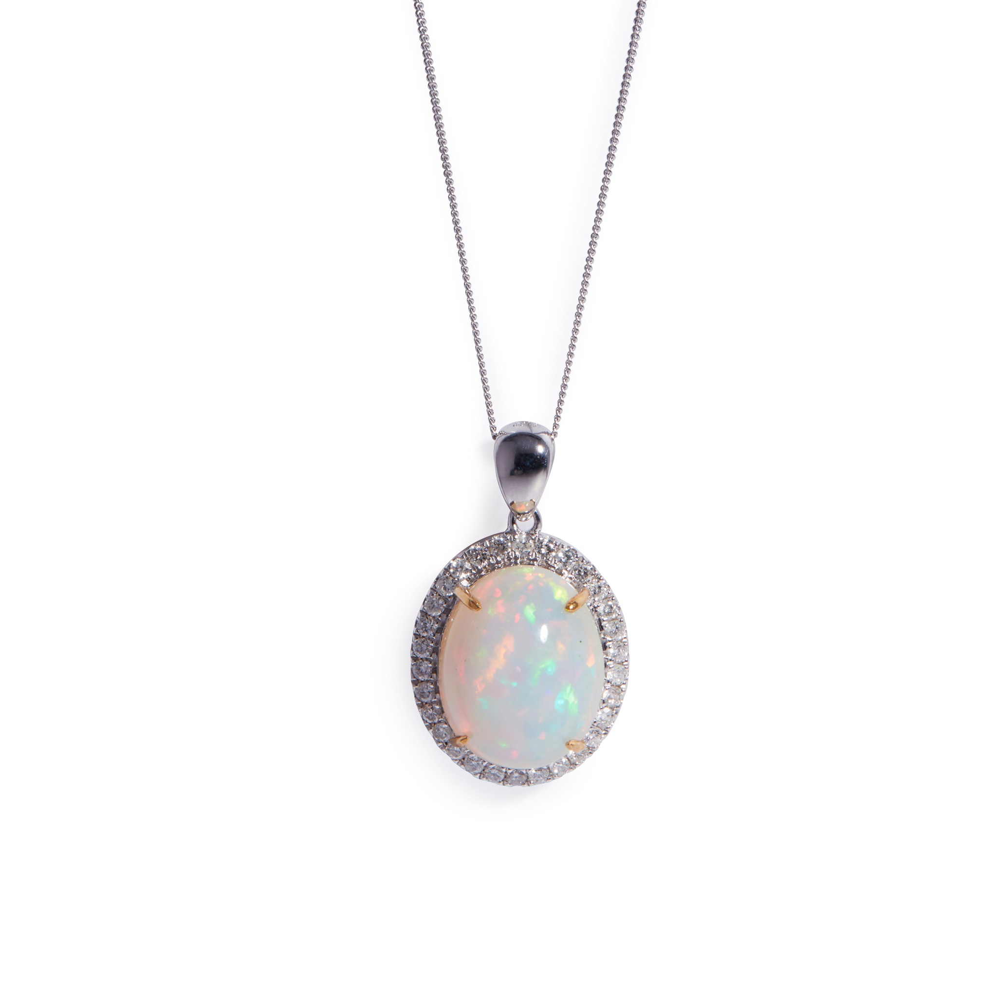 claw-set with an oval opal cabochon in a border of round brilliant-cut diamonds, stamped Au750, to an 18ct gold trace-link chain