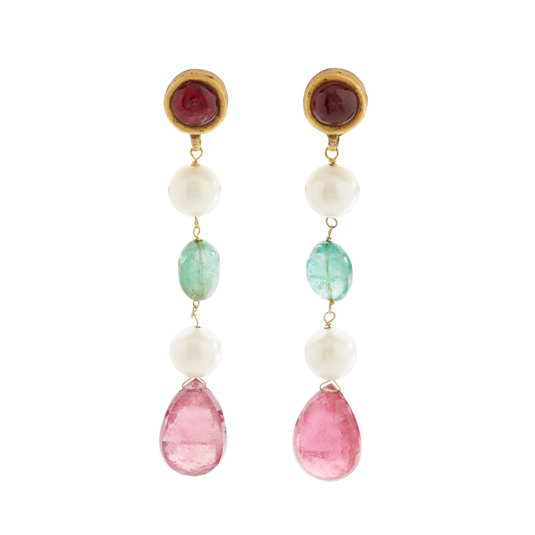 each collet-set with a cabochon pink tourmaline, suspending a drop of two cultured pearls, a polished emerald bead and a faceted pink tourmaline drop, unmarked