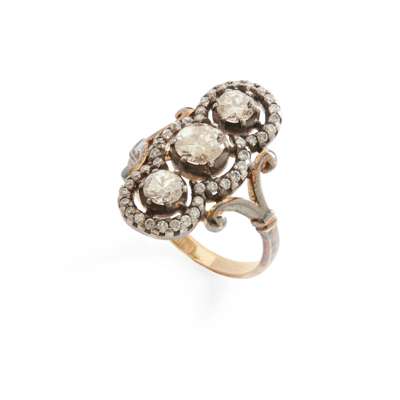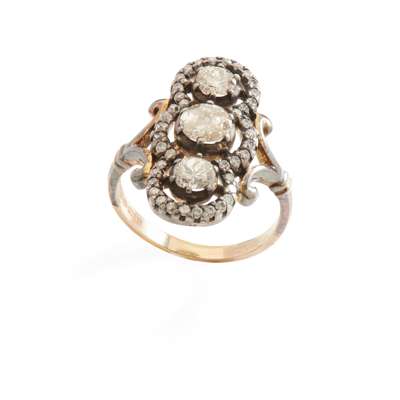 claw-set with three old round-cut diamonds in a smaller border of round brilliant-cut diamonds, unmarked