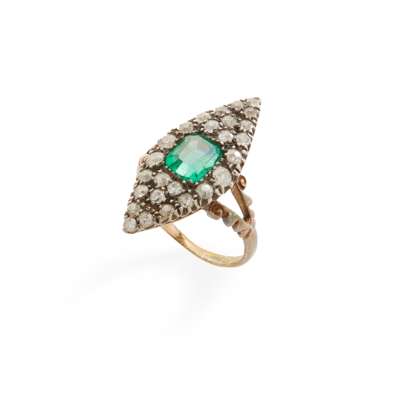 the navette-shaped cluster set with a cut-cornered rectangular-cut emerald-topped doublet and graduated old round-cut diamonds, stamped 18ct