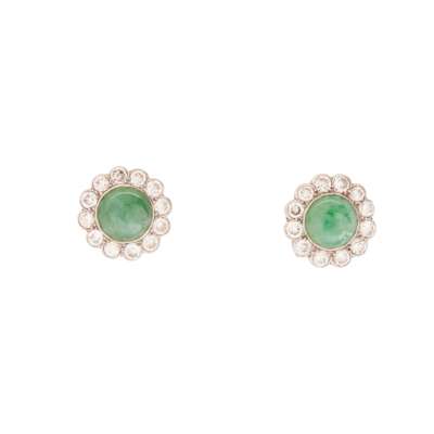 each set with a circular cabochon jadeite in a border of twelve round-cut diamonds, post and butterfly fittings, unmarked