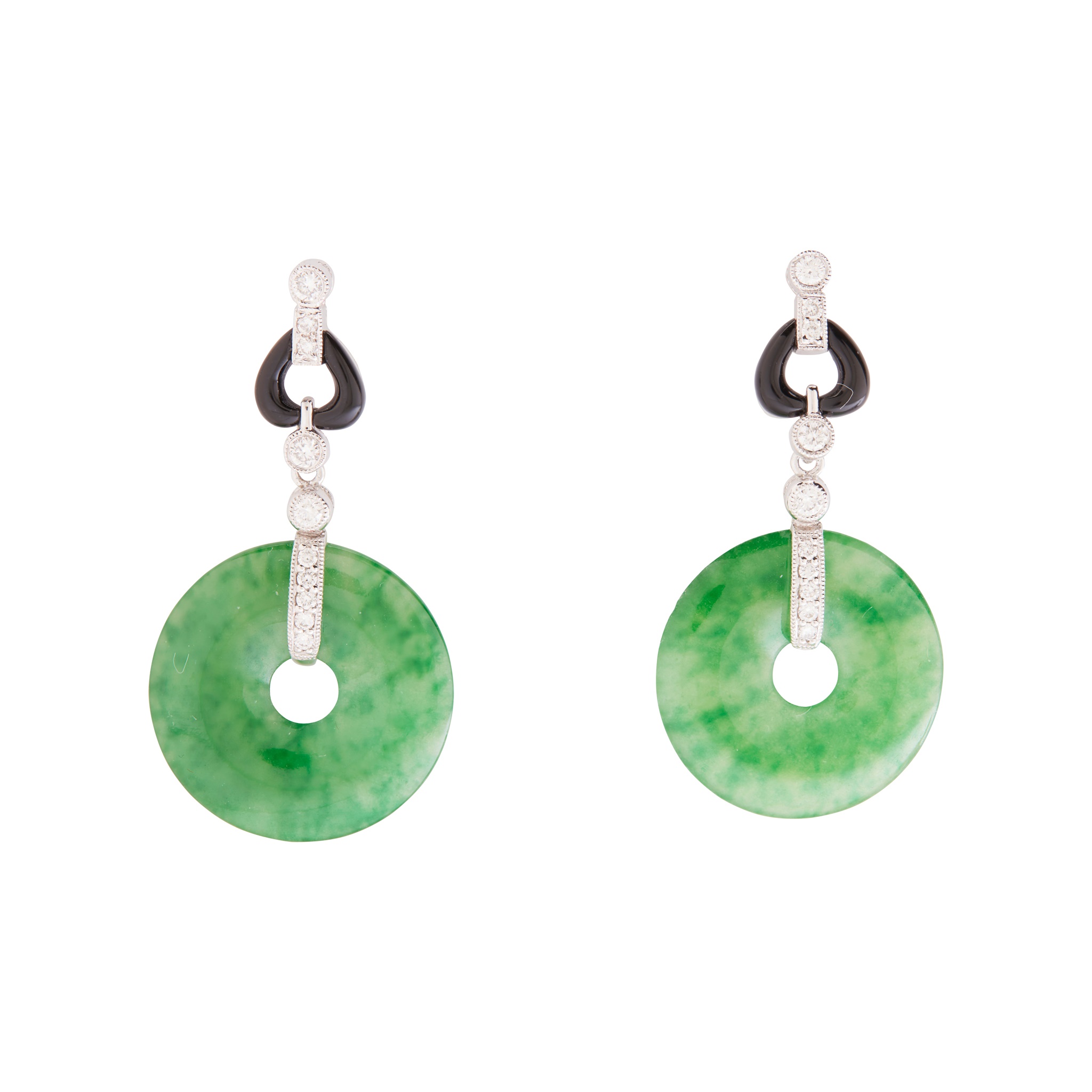 each suspending a circular jadeite disc from a round brilliant-cut diamond and onyx drop, post and butterfly fittings, stamped 750