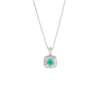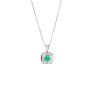 claw-set with a cut-cornered square-cut emerald in a border of round brilliant-cut diamonds, to a fancy link chain, stamped K18WG